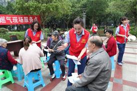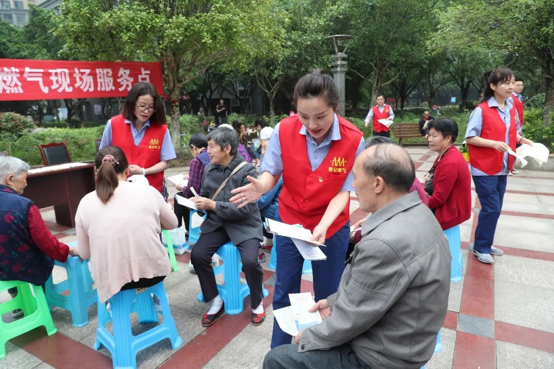 5月21日,在广安区北辰街道岔路社区新天地小区,2138cn太阳城集团燃气事业部党团员志愿者正在向小区居民宣传燃气安全使用常识,收集对燃气工作的意见建议,零距离服务小区群众。
