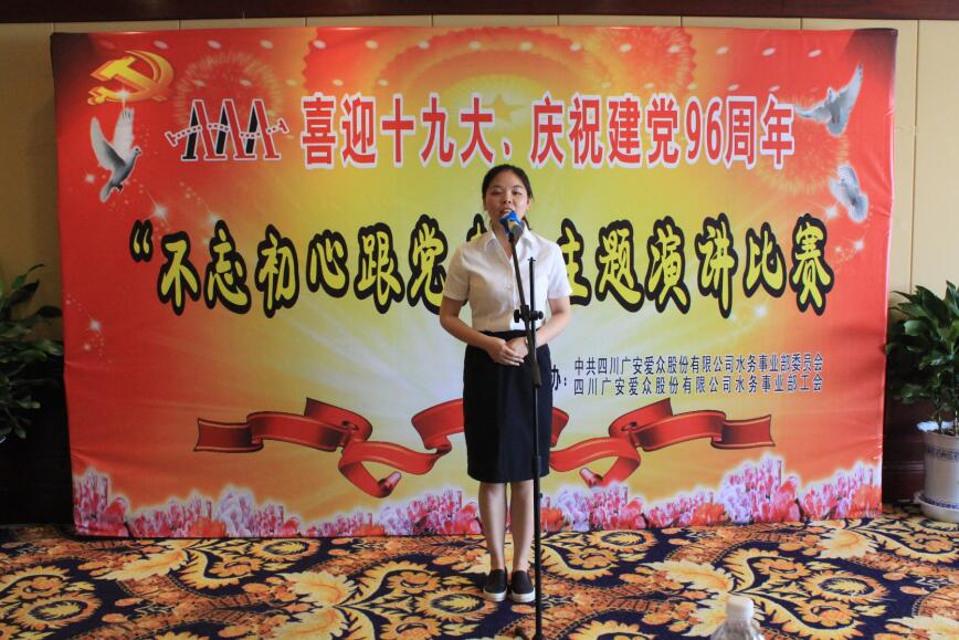 为迎接党的十九大胜利召开,隆重庆祝建党96周年,深入推进“两学一做”学习教育常态化,团结、凝聚职工跟党走,进一步激发广大员工爱党、爱国、爱岗、敬业、奉献的热情,全力推动企业转型发展,6月16日下午,水务事业部党委在玛瑙城国际大酒店峨眉山厅举办了“喜迎十九大·建党96周年·不忘初心跟党走”主题演讲比赛。水务事业部团支书、行政管理部经理张粲主持本次活动。