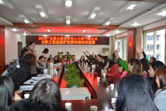 为促进女职工权益法律法规的贯彻学习,增强女职工学法、知法、用法和依法维护自身合法权益的意识和能力,3月8日,燃气事业部举办了女职工权益保护法律法规知识培训,并在培训学习后,开展了迎“三八”女职工权益保护法律法规知识竞赛。